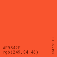 Цвет #F9542E в цветовой модели RGB обозначается тремя октетами (249, 84, 46) в десятичном формате и #F9542E в шестнадцатиричном (hex) формате, которые являются интенсивностью красного 249 (hex F9), интенсивность зелёного 84 (hex 54) и интенсивность синего 46 (hex 2E).