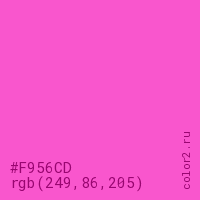 Цвет #F956CD в цветовой модели RGB обозначается тремя октетами (249, 86, 205) в десятичном формате и #F956CD в шестнадцатиричном (hex) формате, которые являются интенсивностью красного 249 (hex F9), интенсивность зелёного 86 (hex 56) и интенсивность синего 205 (hex CD).