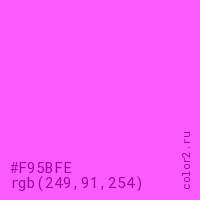 Цвет #F95BFE в цветовой модели RGB обозначается тремя октетами (249, 91, 254) в десятичном формате и #F95BFE в шестнадцатиричном (hex) формате, которые являются интенсивностью красного 249 (hex F9), интенсивность зелёного 91 (hex 5B) и интенсивность синего 254 (hex FE).