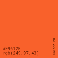Цвет #F9612B в цветовой модели RGB обозначается тремя октетами (249, 97, 43) в десятичном формате и #F9612B в шестнадцатиричном (hex) формате, которые являются интенсивностью красного 249 (hex F9), интенсивность зелёного 97 (hex 61) и интенсивность синего 43 (hex 2B).