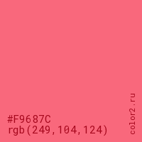Цвет #F9687C в цветовой модели RGB обозначается тремя октетами (249, 104, 124) в десятичном формате и #F9687C в шестнадцатиричном (hex) формате, которые являются интенсивностью красного 249 (hex F9), интенсивность зелёного 104 (hex 68) и интенсивность синего 124 (hex 7C).