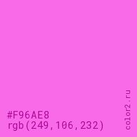 Цвет #F96AE8 в цветовой модели RGB обозначается тремя октетами (249, 106, 232) в десятичном формате и #F96AE8 в шестнадцатиричном (hex) формате, которые являются интенсивностью красного 249 (hex F9), интенсивность зелёного 106 (hex 6A) и интенсивность синего 232 (hex E8).