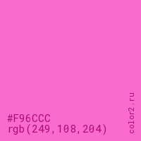 Цвет #F96CCC в цветовой модели RGB обозначается тремя октетами (249, 108, 204) в десятичном формате и #F96CCC в шестнадцатиричном (hex) формате, которые являются интенсивностью красного 249 (hex F9), интенсивность зелёного 108 (hex 6C) и интенсивность синего 204 (hex CC).