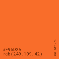 Цвет #F96D2A в цветовой модели RGB обозначается тремя октетами (249, 109, 42) в десятичном формате и #F96D2A в шестнадцатиричном (hex) формате, которые являются интенсивностью красного 249 (hex F9), интенсивность зелёного 109 (hex 6D) и интенсивность синего 42 (hex 2A).