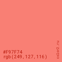 Цвет #F97F74 в цветовой модели RGB обозначается тремя октетами (249, 127, 116) в десятичном формате и #F97F74 в шестнадцатиричном (hex) формате, которые являются интенсивностью красного 249 (hex F9), интенсивность зелёного 127 (hex 7F) и интенсивность синего 116 (hex 74).