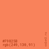 Цвет #F9825B в цветовой модели RGB обозначается тремя октетами (249, 130, 91) в десятичном формате и #F9825B в шестнадцатиричном (hex) формате, которые являются интенсивностью красного 249 (hex F9), интенсивность зелёного 130 (hex 82) и интенсивность синего 91 (hex 5B).