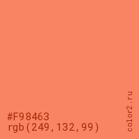 Цвет #F98463 в цветовой модели RGB обозначается тремя октетами (249, 132, 99) в десятичном формате и #F98463 в шестнадцатиричном (hex) формате, которые являются интенсивностью красного 249 (hex F9), интенсивность зелёного 132 (hex 84) и интенсивность синего 99 (hex 63).