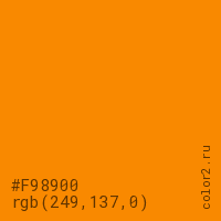 Цвет #F98900 в цветовой модели RGB обозначается тремя октетами (249, 137, 0) в десятичном формате и #F98900 в шестнадцатиричном (hex) формате, которые являются интенсивностью красного 249 (hex F9), интенсивность зелёного 137 (hex 89) и интенсивность синего 0 (hex 00).