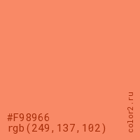 Цвет #F98966 в цветовой модели RGB обозначается тремя октетами (249, 137, 102) в десятичном формате и #F98966 в шестнадцатиричном (hex) формате, которые являются интенсивностью красного 249 (hex F9), интенсивность зелёного 137 (hex 89) и интенсивность синего 102 (hex 66).