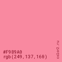 Цвет #F989A0 в цветовой модели RGB обозначается тремя октетами (249, 137, 160) в десятичном формате и #F989A0 в шестнадцатиричном (hex) формате, которые являются интенсивностью красного 249 (hex F9), интенсивность зелёного 137 (hex 89) и интенсивность синего 160 (hex A0).