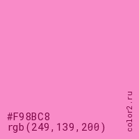 Цвет #F98BC8 в цветовой модели RGB обозначается тремя октетами (249, 139, 200) в десятичном формате и #F98BC8 в шестнадцатиричном (hex) формате, которые являются интенсивностью красного 249 (hex F9), интенсивность зелёного 139 (hex 8B) и интенсивность синего 200 (hex C8).