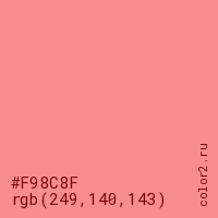 Цвет #F98C8F в цветовой модели RGB обозначается тремя октетами (249, 140, 143) в десятичном формате и #F98C8F в шестнадцатиричном (hex) формате, которые являются интенсивностью красного 249 (hex F9), интенсивность зелёного 140 (hex 8C) и интенсивность синего 143 (hex 8F).