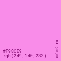 Цвет #F98CE9 в цветовой модели RGB обозначается тремя октетами (249, 140, 233) в десятичном формате и #F98CE9 в шестнадцатиричном (hex) формате, которые являются интенсивностью красного 249 (hex F9), интенсивность зелёного 140 (hex 8C) и интенсивность синего 233 (hex E9).