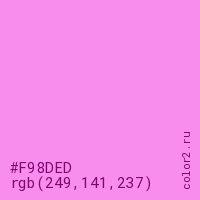 Цвет #F98DED в цветовой модели RGB обозначается тремя октетами (249, 141, 237) в десятичном формате и #F98DED в шестнадцатиричном (hex) формате, которые являются интенсивностью красного 249 (hex F9), интенсивность зелёного 141 (hex 8D) и интенсивность синего 237 (hex ED).