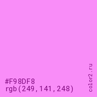 Цвет #F98DF8 в цветовой модели RGB обозначается тремя октетами (249, 141, 248) в десятичном формате и #F98DF8 в шестнадцатиричном (hex) формате, которые являются интенсивностью красного 249 (hex F9), интенсивность зелёного 141 (hex 8D) и интенсивность синего 248 (hex F8).