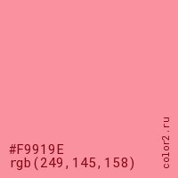 Цвет #F9919E в цветовой модели RGB обозначается тремя октетами (249, 145, 158) в десятичном формате и #F9919E в шестнадцатиричном (hex) формате, которые являются интенсивностью красного 249 (hex F9), интенсивность зелёного 145 (hex 91) и интенсивность синего 158 (hex 9E).