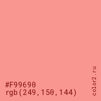Цвет #F99690 в цветовой модели RGB обозначается тремя октетами (249, 150, 144) в десятичном формате и #F99690 в шестнадцатиричном (hex) формате, которые являются интенсивностью красного 249 (hex F9), интенсивность зелёного 150 (hex 96) и интенсивность синего 144 (hex 90).