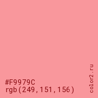 Цвет #F9979C в цветовой модели RGB обозначается тремя октетами (249, 151, 156) в десятичном формате и #F9979C в шестнадцатиричном (hex) формате, которые являются интенсивностью красного 249 (hex F9), интенсивность зелёного 151 (hex 97) и интенсивность синего 156 (hex 9C).