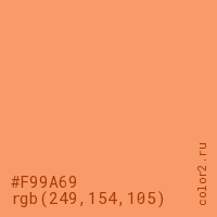Цвет #F99A69 в цветовой модели RGB обозначается тремя октетами (249, 154, 105) в десятичном формате и #F99A69 в шестнадцатиричном (hex) формате, которые являются интенсивностью красного 249 (hex F9), интенсивность зелёного 154 (hex 9A) и интенсивность синего 105 (hex 69).