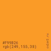 Цвет #F99B26 в цветовой модели RGB обозначается тремя октетами (249, 155, 38) в десятичном формате и #F99B26 в шестнадцатиричном (hex) формате, которые являются интенсивностью красного 249 (hex F9), интенсивность зелёного 155 (hex 9B) и интенсивность синего 38 (hex 26).