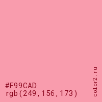 Цвет #F99CAD в цветовой модели RGB обозначается тремя октетами (249, 156, 173) в десятичном формате и #F99CAD в шестнадцатиричном (hex) формате, которые являются интенсивностью красного 249 (hex F9), интенсивность зелёного 156 (hex 9C) и интенсивность синего 173 (hex AD).