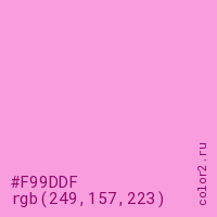 Цвет #F99DDF в цветовой модели RGB обозначается тремя октетами (249, 157, 223) в десятичном формате и #F99DDF в шестнадцатиричном (hex) формате, которые являются интенсивностью красного 249 (hex F9), интенсивность зелёного 157 (hex 9D) и интенсивность синего 223 (hex DF).