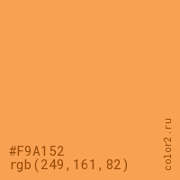 Цвет #F9A152 в цветовой модели RGB обозначается тремя октетами (249, 161, 82) в десятичном формате и #F9A152 в шестнадцатиричном (hex) формате, которые являются интенсивностью красного 249 (hex F9), интенсивность зелёного 161 (hex A1) и интенсивность синего 82 (hex 52).