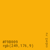 Цвет #F9B009 в цветовой модели RGB обозначается тремя октетами (249, 176, 9) в десятичном формате и #F9B009 в шестнадцатиричном (hex) формате, которые являются интенсивностью красного 249 (hex F9), интенсивность зелёного 176 (hex B0) и интенсивность синего 9 (hex 09).