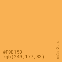 Цвет #F9B153 в цветовой модели RGB обозначается тремя октетами (249, 177, 83) в десятичном формате и #F9B153 в шестнадцатиричном (hex) формате, которые являются интенсивностью красного 249 (hex F9), интенсивность зелёного 177 (hex B1) и интенсивность синего 83 (hex 53).