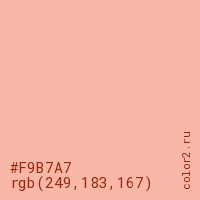 Цвет #F9B7A7 в цветовой модели RGB обозначается тремя октетами (249, 183, 167) в десятичном формате и #F9B7A7 в шестнадцатиричном (hex) формате, которые являются интенсивностью красного 249 (hex F9), интенсивность зелёного 183 (hex B7) и интенсивность синего 167 (hex A7).