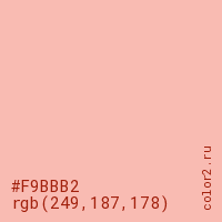 Цвет #F9BBB2 в цветовой модели RGB обозначается тремя октетами (249, 187, 178) в десятичном формате и #F9BBB2 в шестнадцатиричном (hex) формате, которые являются интенсивностью красного 249 (hex F9), интенсивность зелёного 187 (hex BB) и интенсивность синего 178 (hex B2).