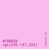 Цвет #F9BBEB в цветовой модели RGB обозначается тремя октетами (249, 187, 235) в десятичном формате и #F9BBEB в шестнадцатиричном (hex) формате, которые являются интенсивностью красного 249 (hex F9), интенсивность зелёного 187 (hex BB) и интенсивность синего 235 (hex EB).
