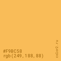 Цвет #F9BC58 в цветовой модели RGB обозначается тремя октетами (249, 188, 88) в десятичном формате и #F9BC58 в шестнадцатиричном (hex) формате, которые являются интенсивностью красного 249 (hex F9), интенсивность зелёного 188 (hex BC) и интенсивность синего 88 (hex 58).