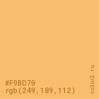Цвет #F9BD70 в цветовой модели RGB обозначается тремя октетами (249, 189, 112) в десятичном формате и #F9BD70 в шестнадцатиричном (hex) формате, которые являются интенсивностью красного 249 (hex F9), интенсивность зелёного 189 (hex BD) и интенсивность синего 112 (hex 70).