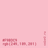 Цвет #F9BDC9 в цветовой модели RGB обозначается тремя октетами (249, 189, 201) в десятичном формате и #F9BDC9 в шестнадцатиричном (hex) формате, которые являются интенсивностью красного 249 (hex F9), интенсивность зелёного 189 (hex BD) и интенсивность синего 201 (hex C9).