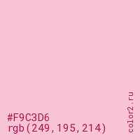 Цвет #F9C3D6 в цветовой модели RGB обозначается тремя октетами (249, 195, 214) в десятичном формате и #F9C3D6 в шестнадцатиричном (hex) формате, которые являются интенсивностью красного 249 (hex F9), интенсивность зелёного 195 (hex C3) и интенсивность синего 214 (hex D6).