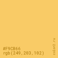 Цвет #F9CB66 в цветовой модели RGB обозначается тремя октетами (249, 203, 102) в десятичном формате и #F9CB66 в шестнадцатиричном (hex) формате, которые являются интенсивностью красного 249 (hex F9), интенсивность зелёного 203 (hex CB) и интенсивность синего 102 (hex 66).