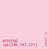 Цвет #F9CFDD в цветовой модели RGB обозначается тремя октетами (249, 207, 221) в десятичном формате и #F9CFDD в шестнадцатиричном (hex) формате, которые являются интенсивностью красного 249 (hex F9), интенсивность зелёного 207 (hex CF) и интенсивность синего 221 (hex DD).