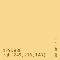 Цвет #F9D88F в цветовой модели RGB обозначается тремя октетами (249, 216, 143) в десятичном формате и #F9D88F в шестнадцатиричном (hex) формате, которые являются интенсивностью красного 249 (hex F9), интенсивность зелёного 216 (hex D8) и интенсивность синего 143 (hex 8F).