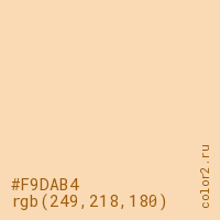 Цвет #F9DAB4 в цветовой модели RGB обозначается тремя октетами (249, 218, 180) в десятичном формате и #F9DAB4 в шестнадцатиричном (hex) формате, которые являются интенсивностью красного 249 (hex F9), интенсивность зелёного 218 (hex DA) и интенсивность синего 180 (hex B4).