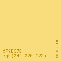 Цвет #F9DC7B в цветовой модели RGB обозначается тремя октетами (249, 220, 123) в десятичном формате и #F9DC7B в шестнадцатиричном (hex) формате, которые являются интенсивностью красного 249 (hex F9), интенсивность зелёного 220 (hex DC) и интенсивность синего 123 (hex 7B).