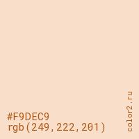 Цвет #F9DEC9 в цветовой модели RGB обозначается тремя октетами (249, 222, 201) в десятичном формате и #F9DEC9 в шестнадцатиричном (hex) формате, которые являются интенсивностью красного 249 (hex F9), интенсивность зелёного 222 (hex DE) и интенсивность синего 201 (hex C9).