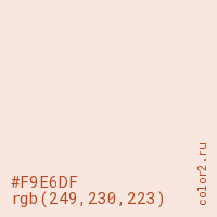 Цвет RGB(249, 230, 223) в процентом отношении количества цвета состоит из 97.6% красного (red), 90.2% зелёного (green) и 87.5% синего (blue).