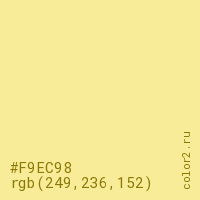 Цвет #F9EC98 в цветовой модели RGB обозначается тремя октетами (249, 236, 152) в десятичном формате и #F9EC98 в шестнадцатиричном (hex) формате, которые являются интенсивностью красного 249 (hex F9), интенсивность зелёного 236 (hex EC) и интенсивность синего 152 (hex 98).