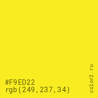 Цвет #F9ED22 в цветовой модели RGB обозначается тремя октетами (249, 237, 34) в десятичном формате и #F9ED22 в шестнадцатиричном (hex) формате, которые являются интенсивностью красного 249 (hex F9), интенсивность зелёного 237 (hex ED) и интенсивность синего 34 (hex 22).