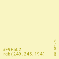 Цвет #F9F5C2 в цветовой модели RGB обозначается тремя октетами (249, 245, 194) в десятичном формате и #F9F5C2 в шестнадцатиричном (hex) формате, которые являются интенсивностью красного 249 (hex F9), интенсивность зелёного 245 (hex F5) и интенсивность синего 194 (hex C2).