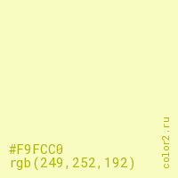 Цвет #F9FCC0 в цветовой модели RGB обозначается тремя октетами (249, 252, 192) в десятичном формате и #F9FCC0 в шестнадцатиричном (hex) формате, которые являются интенсивностью красного 249 (hex F9), интенсивность зелёного 252 (hex FC) и интенсивность синего 192 (hex C0).