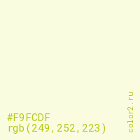 Цвет #F9FCDF в цветовой модели RGB обозначается тремя октетами (249, 252, 223) в десятичном формате и #F9FCDF в шестнадцатиричном (hex) формате, которые являются интенсивностью красного 249 (hex F9), интенсивность зелёного 252 (hex FC) и интенсивность синего 223 (hex DF).