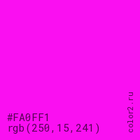 Цвет #FA0FF1 в цветовой модели RGB обозначается тремя октетами (250, 15, 241) в десятичном формате и #FA0FF1 в шестнадцатиричном (hex) формате, которые являются интенсивностью красного 250 (hex FA), интенсивность зелёного 15 (hex 0F) и интенсивность синего 241 (hex F1).