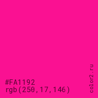 Цвет #FA1192 в цветовой модели RGB обозначается тремя октетами (250, 17, 146) в десятичном формате и #FA1192 в шестнадцатиричном (hex) формате, которые являются интенсивностью красного 250 (hex FA), интенсивность зелёного 17 (hex 11) и интенсивность синего 146 (hex 92).